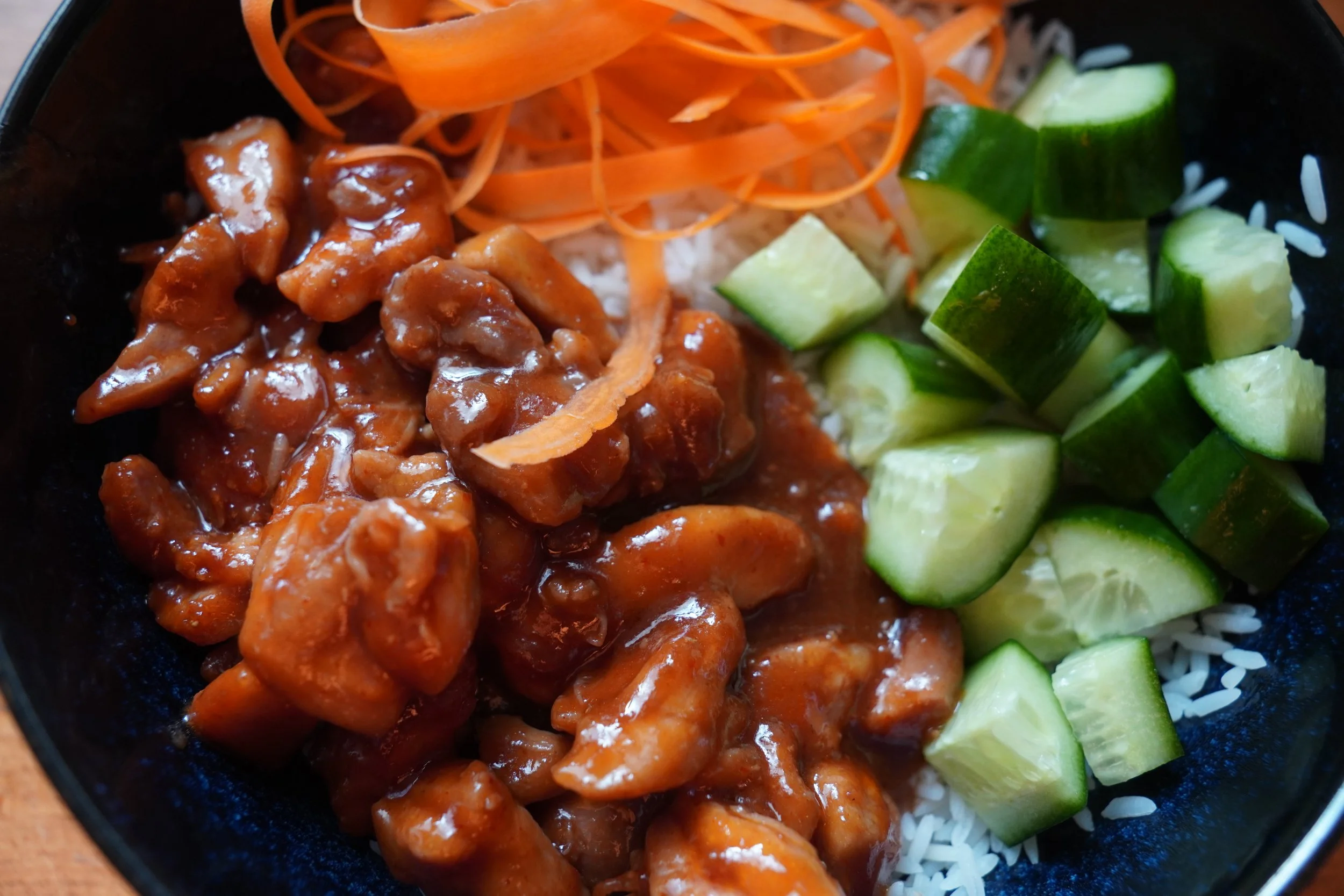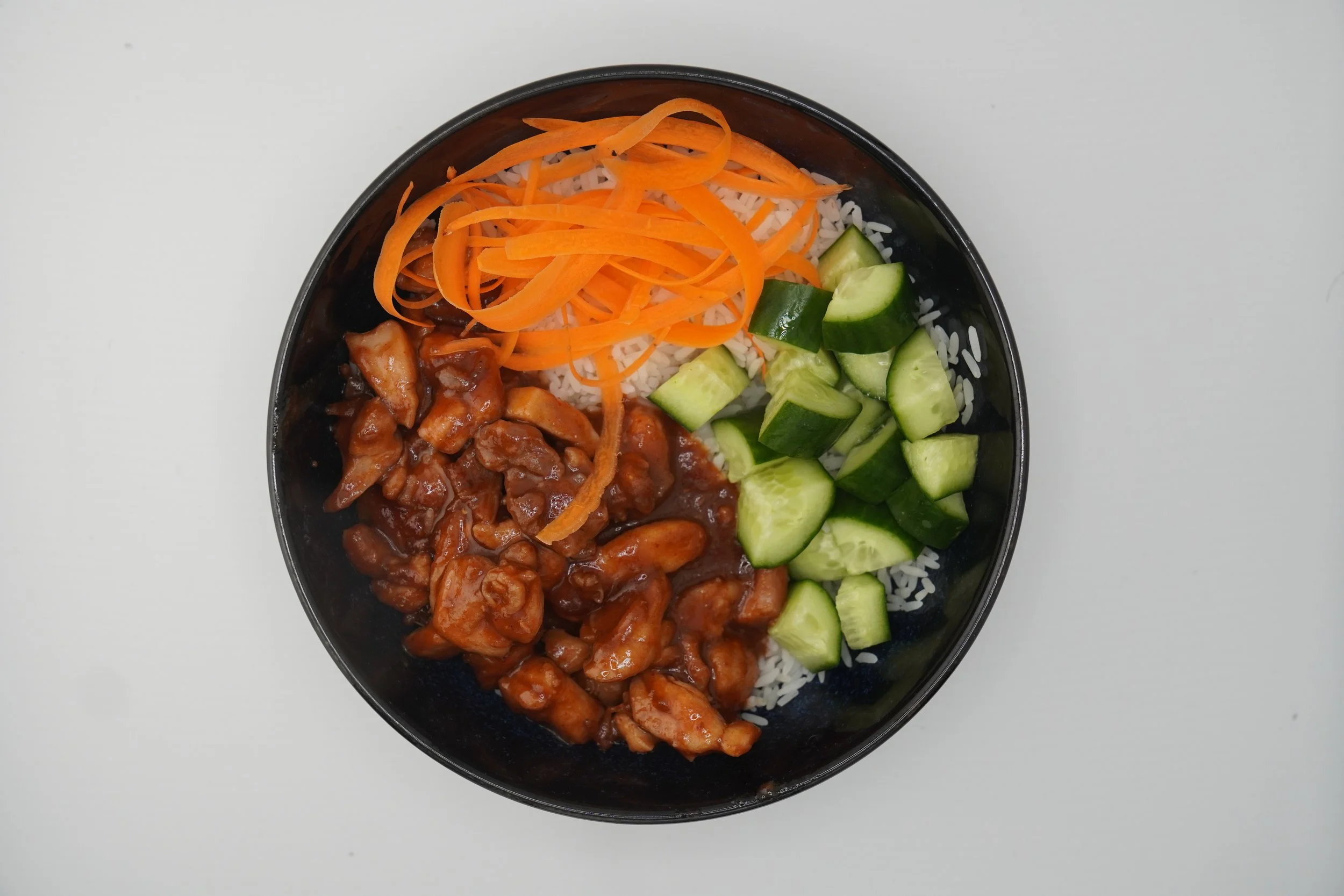 Construct bowl - spoonful of rice, chicken on one side, vegetables on the other.